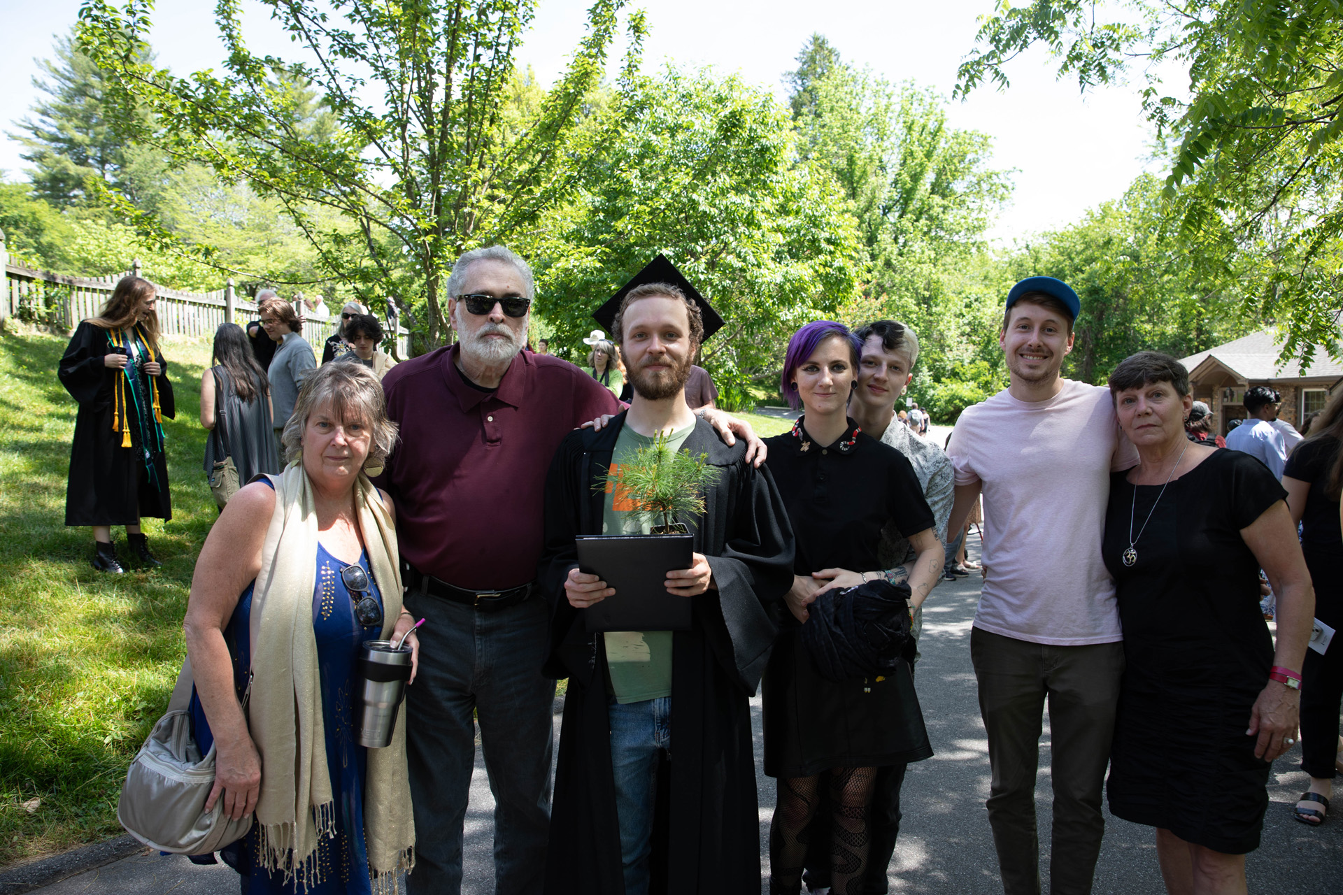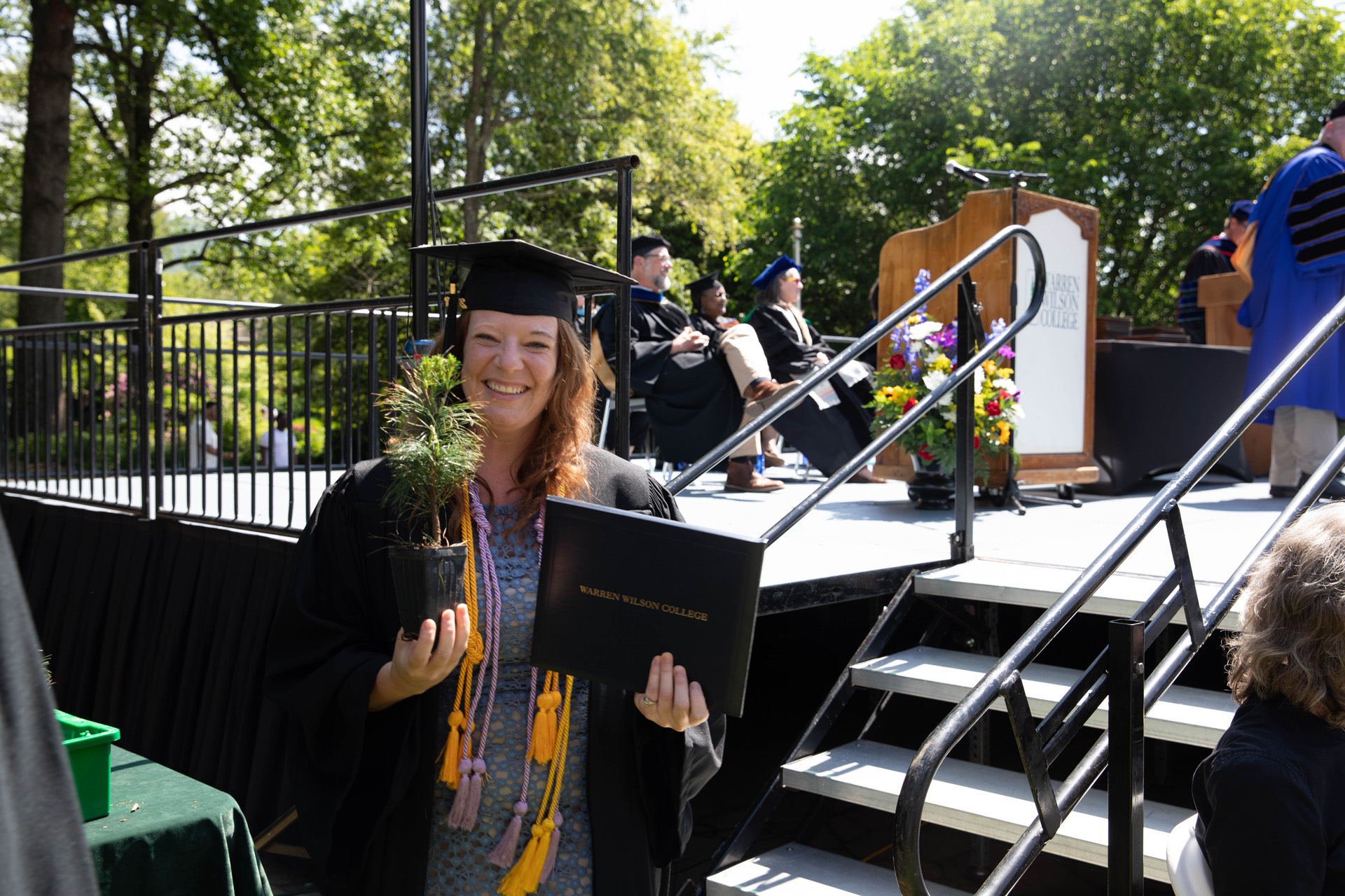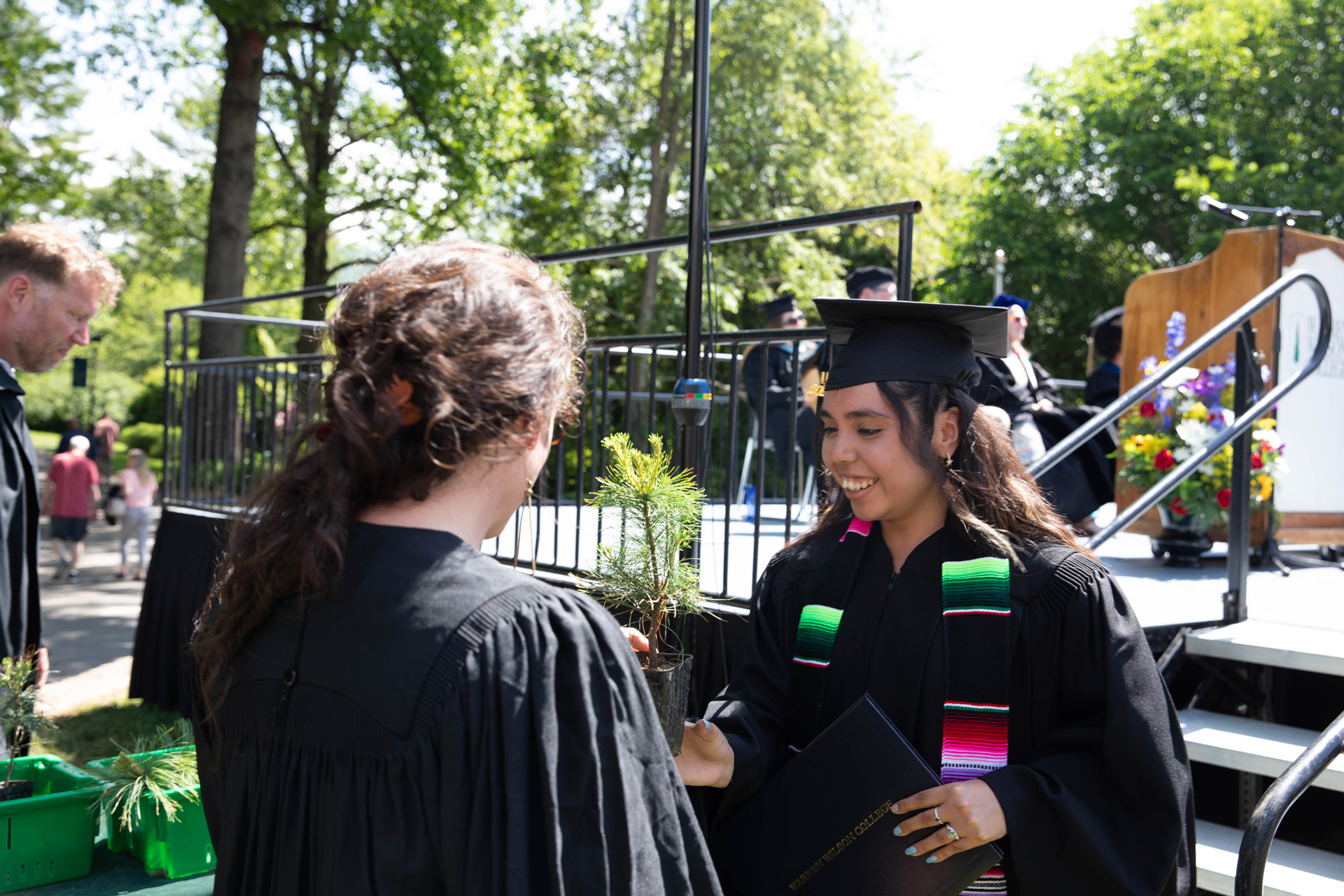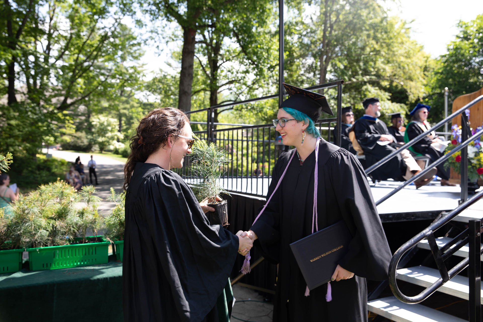 As they walked across the stage, the students received white pine tree saplings. A Warren Wilson tradition, the sapling represents the part of Warren Wilson that each graduate will take with them. Just as each graduate leaves the college to go, lay down roots, and grow, the graduate is encouraged to plant the tree away from campus to represent their mark as a Warren Wilson graduate in the greater world.
