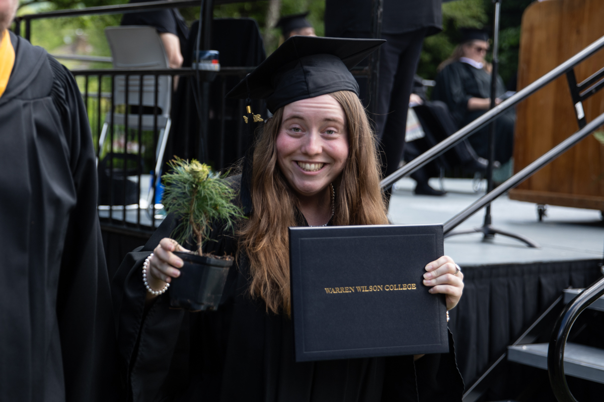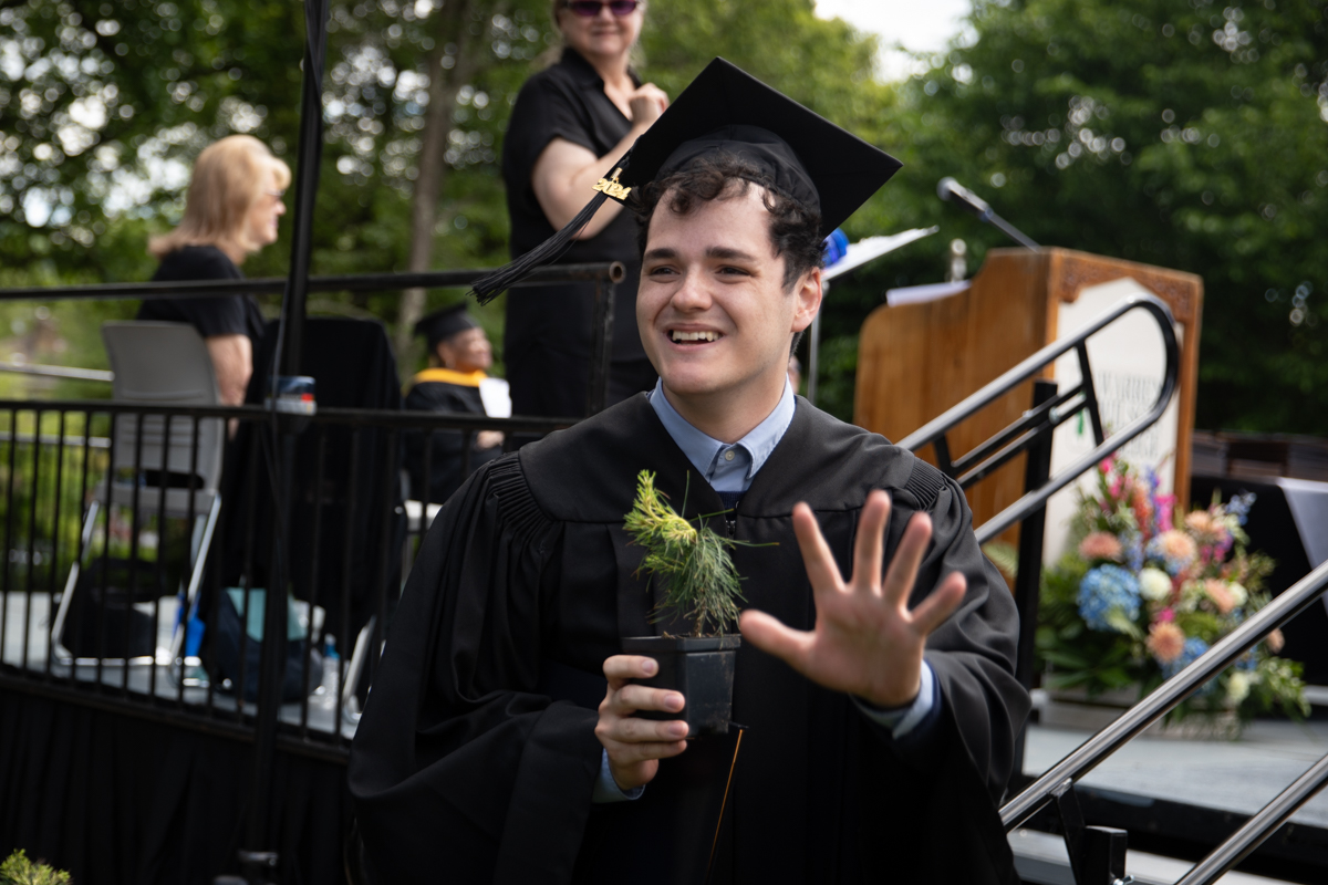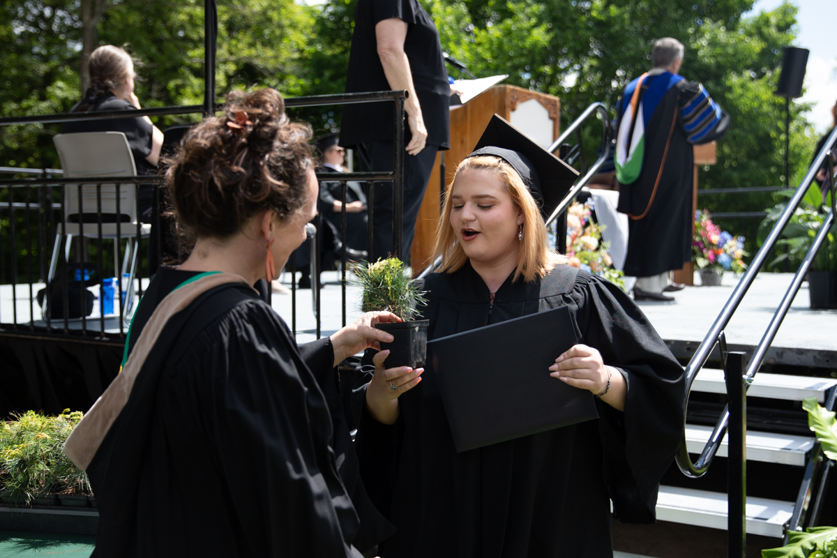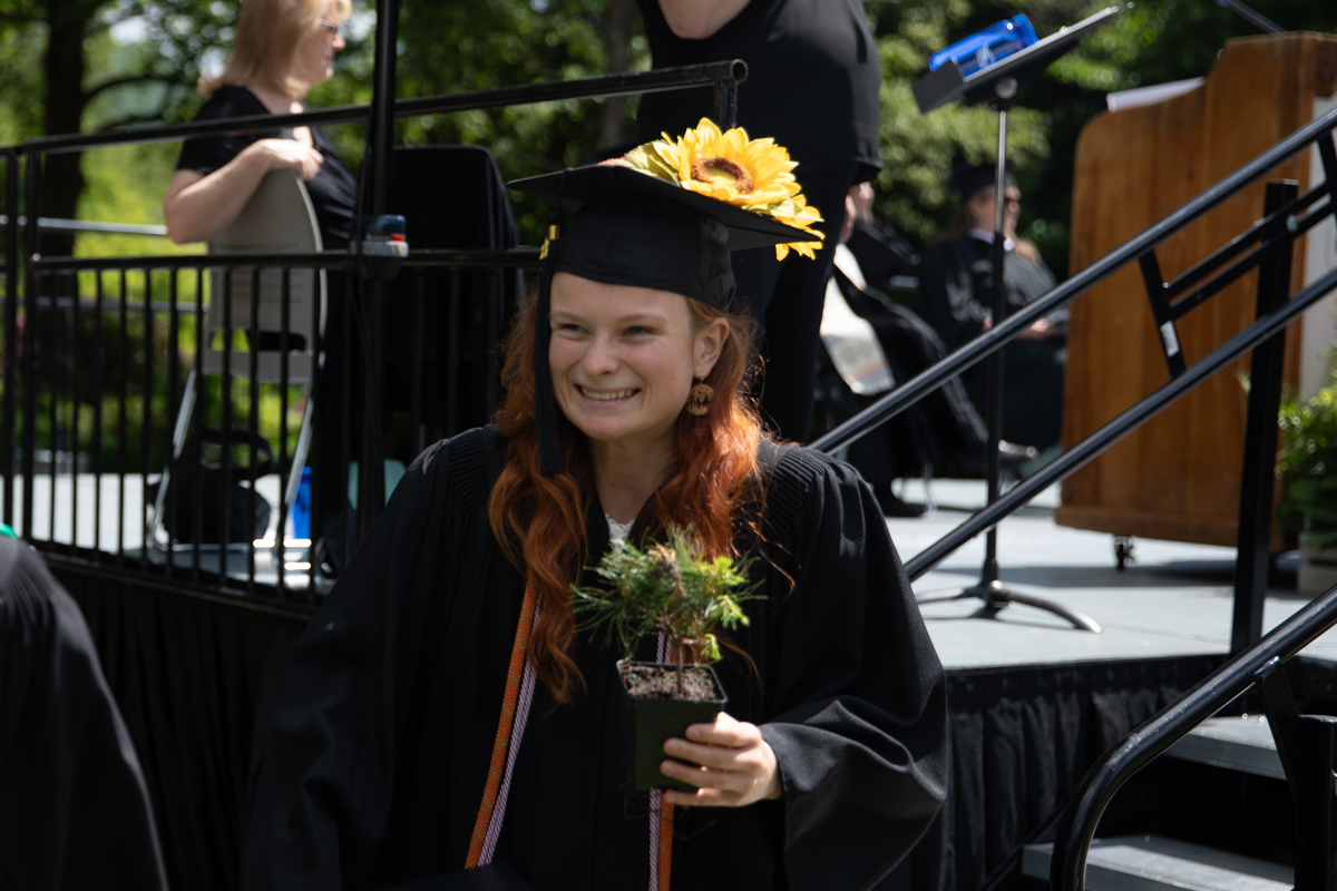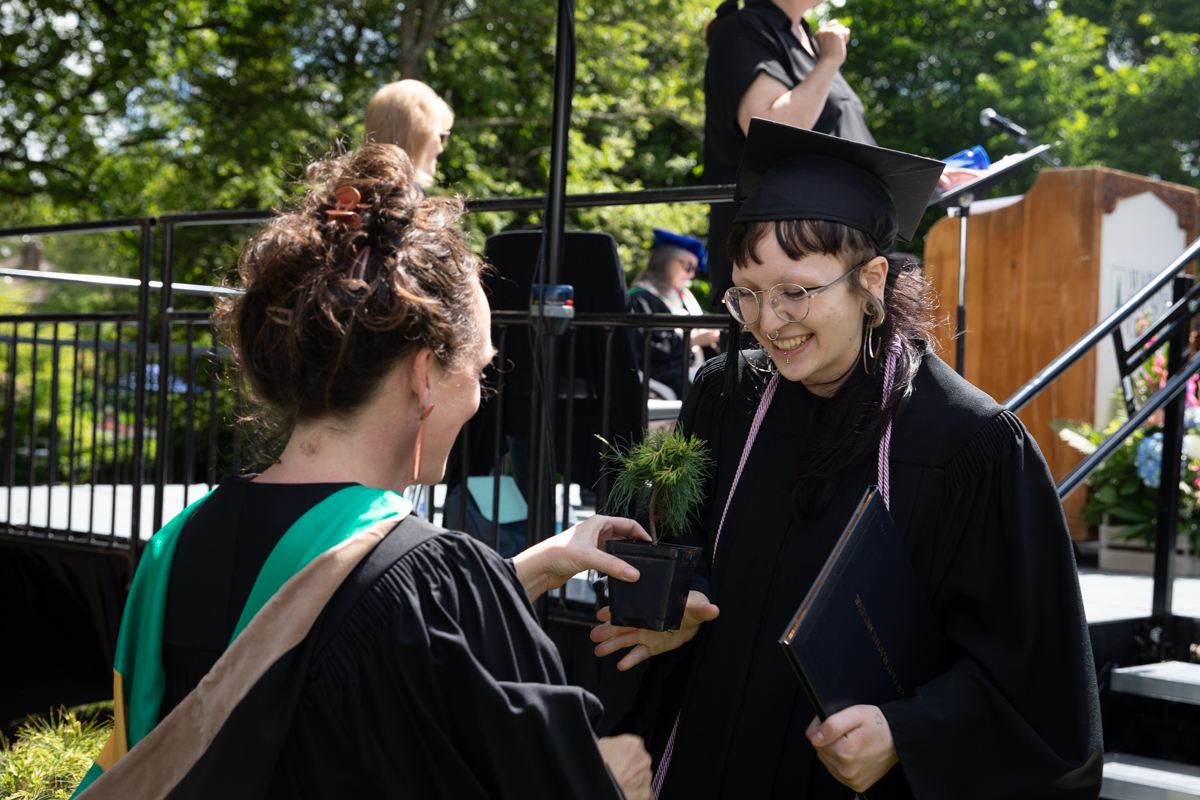 As they walked across the stage, the students received white pine tree saplings. A Warren Wilson tradition, the sapling represents the part of Warren Wilson that each graduate will take with them. Just as each graduate leaves the college to go, lay down roots, and grow, the graduate is encouraged to plant the tree away from campus to represent their mark as a Warren Wilson graduate in the greater world.