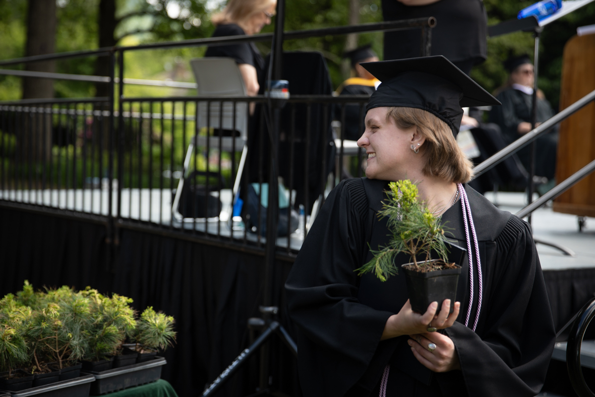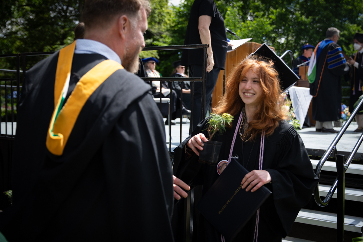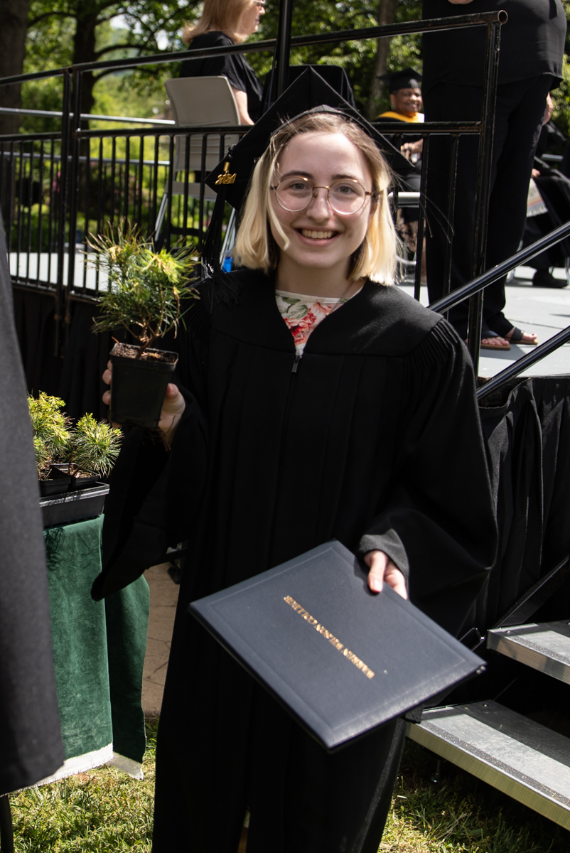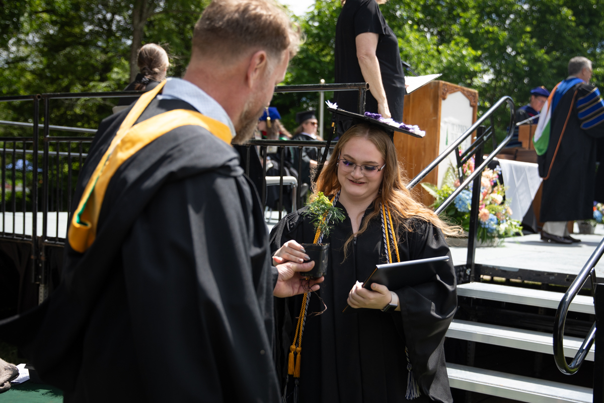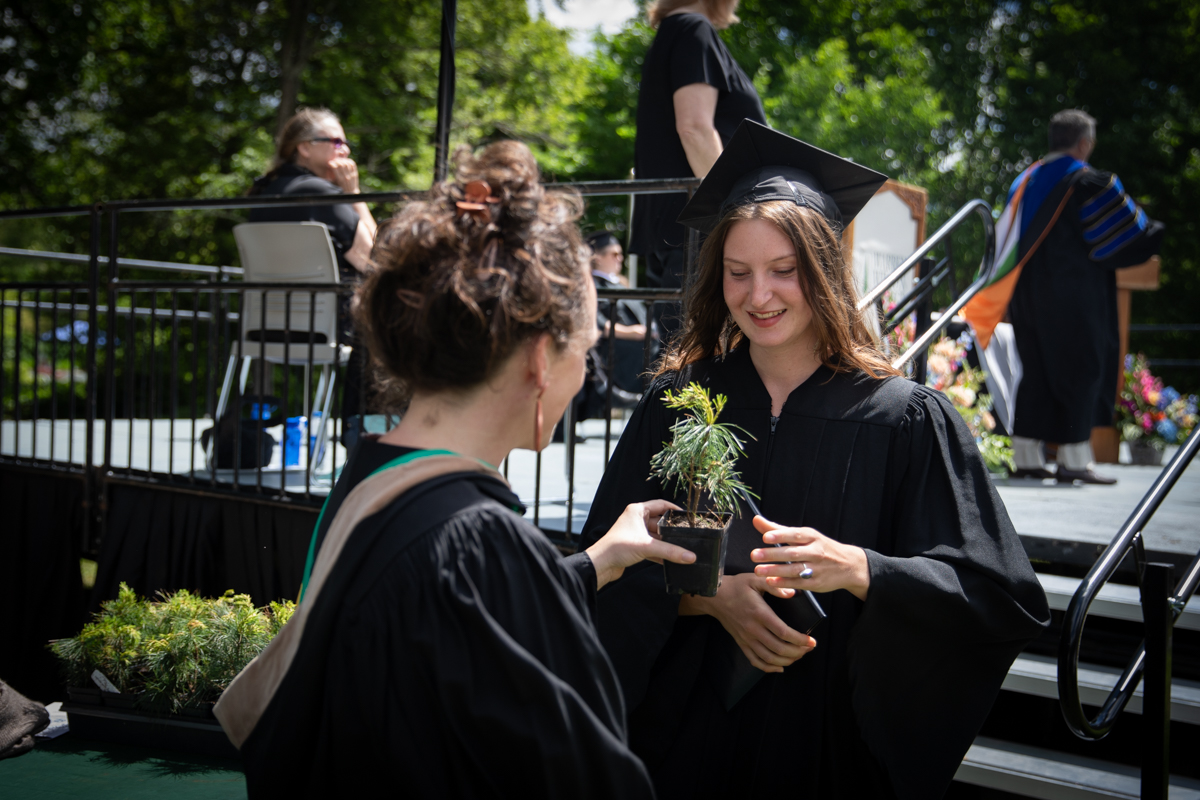 As they walked across the stage, the students received white pine tree saplings. A Warren Wilson tradition, the sapling represents the part of Warren Wilson that each graduate will take with them. Just as each graduate leaves the college to go, lay down roots, and grow, the graduate is encouraged to plant the tree away from campus to represent their mark as a Warren Wilson graduate in the greater world.