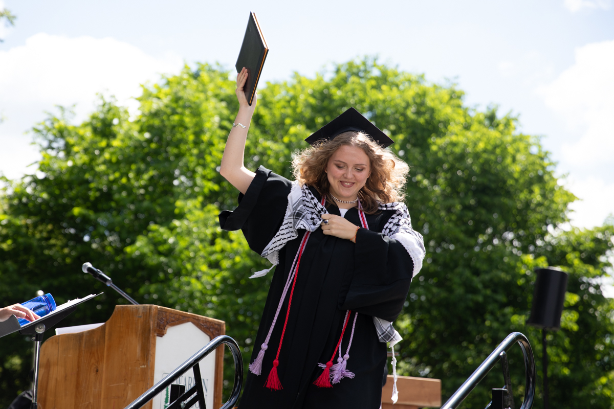 Later in the ceremony, graduating music major Kendall Hite performed an original song, “Moss & Vine,” accompanied by professors Natalya Weinstein Miller, Jason DeCristofaro and Kevin Kehrberg.