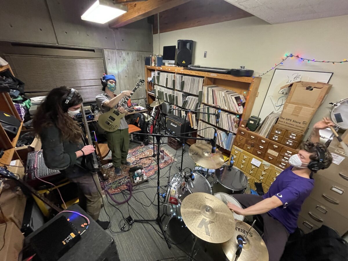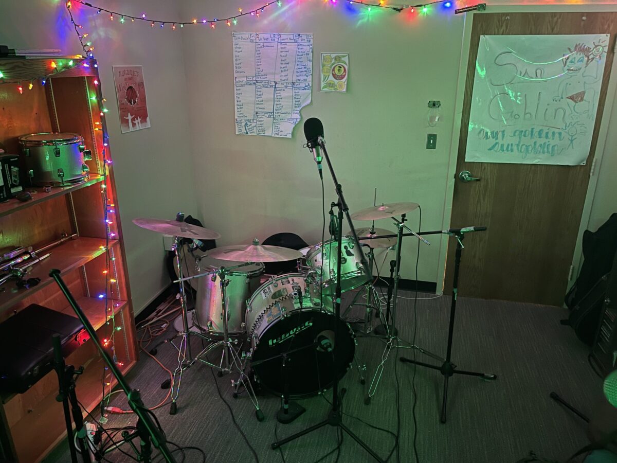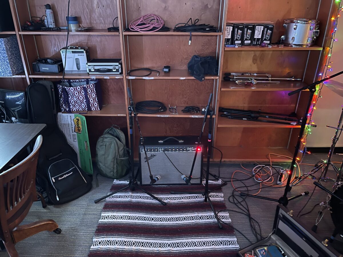 Studio B is a satellite location of the Sound Lab, designed for louder, electrified recording projects. Think drums, amplifiers, and full bands–anything that’s too noisy for the library!